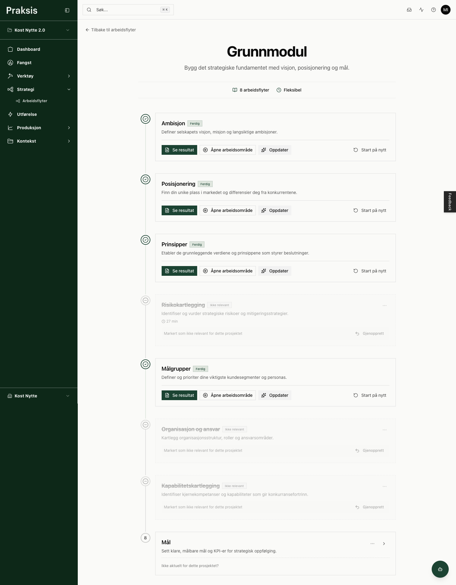 Praksis er et arbeidsrom for å bygge strategisk kontekst som gjør AI-verktøyene dine bedre. Du jobber med strategi, og alt du produserer blir til kontekst AI kan bruke.